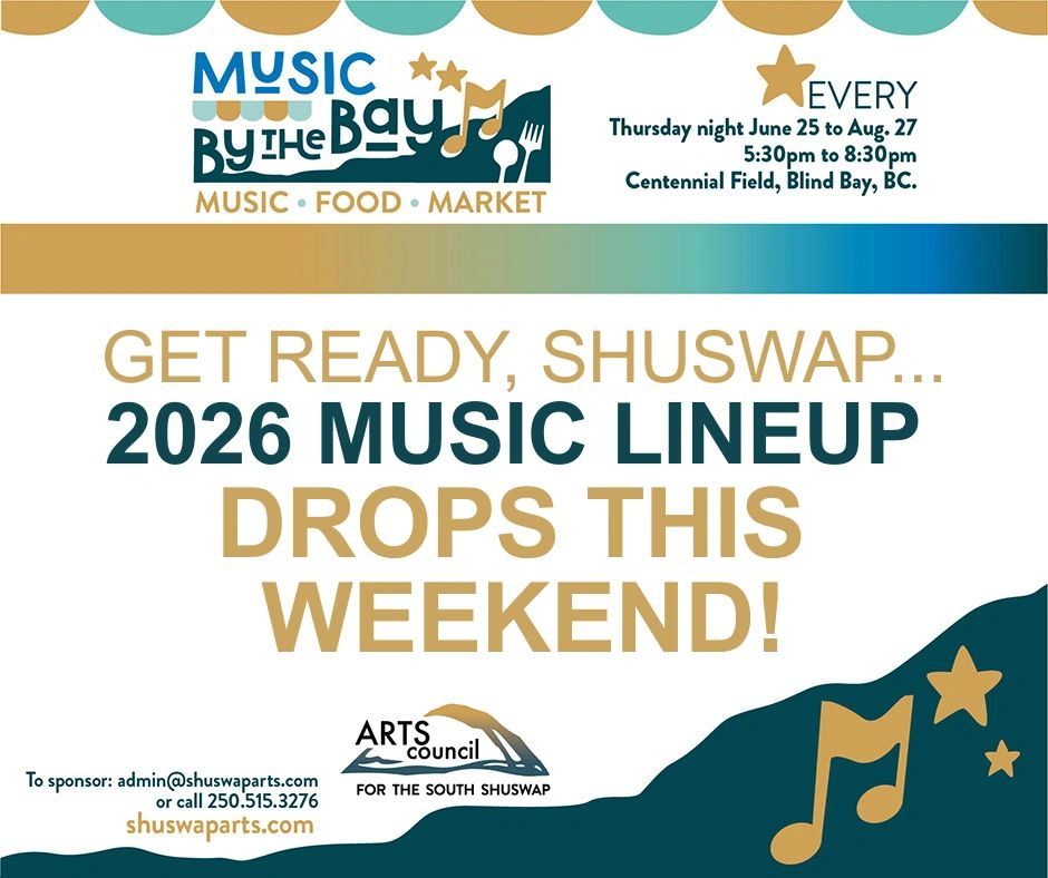 At Arts Council for the South Shuswap, we believe in the transformative power of arts and community collaboration. Music By the Bay is one of the South Shuswap's most beloved events of the summer! Running every Thursday evening, from June 25th to August 27, 2026, this free community event brings together our community